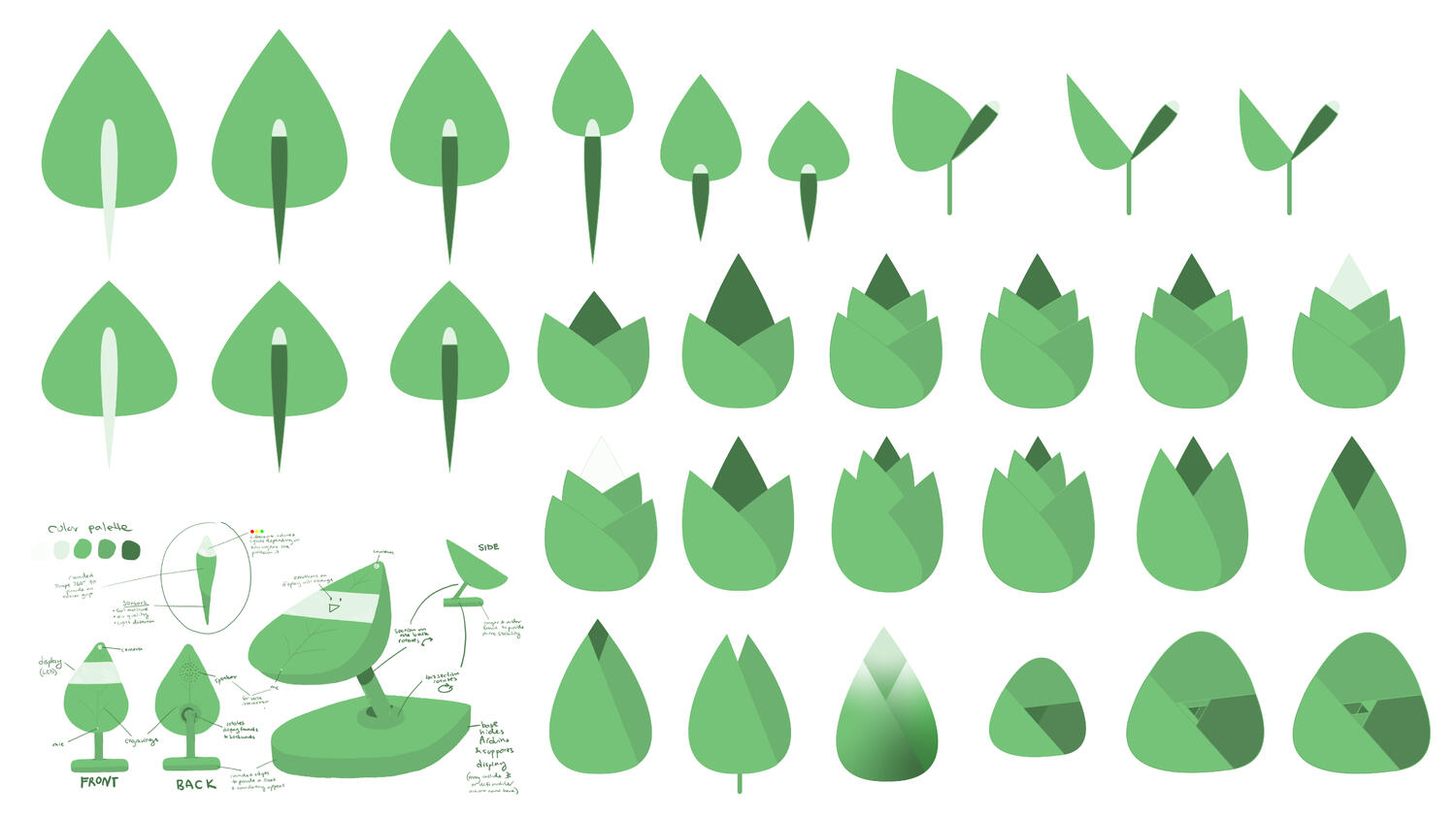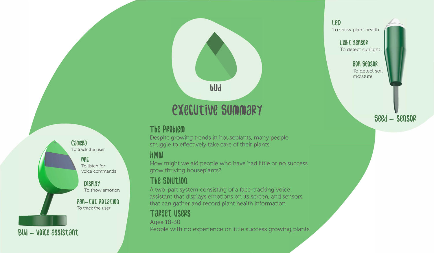 Conceptually, we wanted to create a robot that was in the shape of a simplified leaf, which included a screen for animated visuals, a microphone and speaker for audial input and output, and a stand as a sturdy base. We called the robot, Bud, as it was the start of our team and of a a plant before it blooms.The robot would also come with a sensor, Seed, which would detect the water levels and PH of the soil.