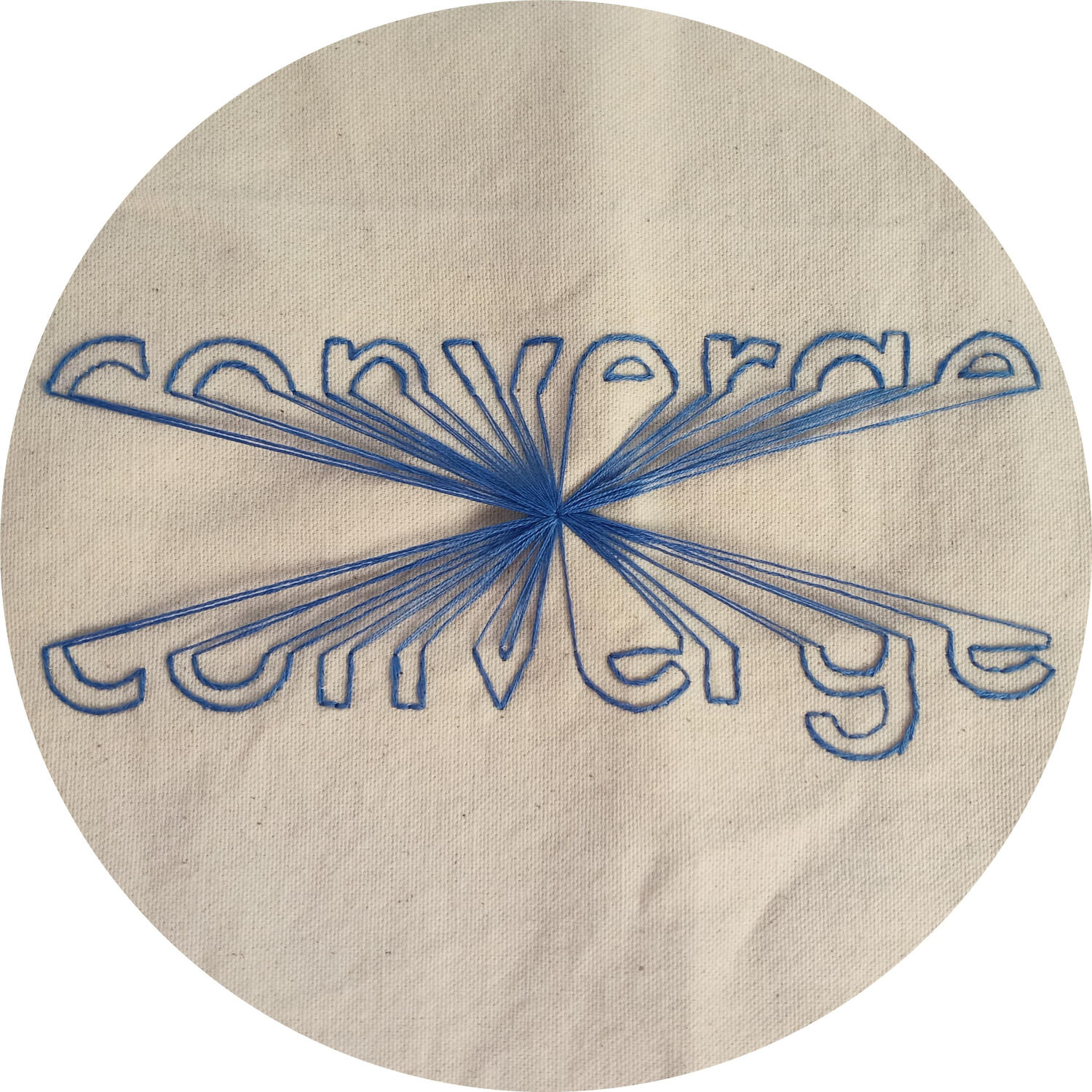 An embroidered fabric which depicts the definition of a word in action. The word I chose for this project is, converge, which means to "move toward one point or one another or come together," according to Merriam Webster.I had brainstormed other words as well, as seen below in my thumbnails, however, I wanted to weave my love for embroidery into my budding knowledge for design. This was an act of combining something I was familiar with, with something I was continuing to understand more about.The word, converge, was perfect for this project, as all of the lines of thread came together in a singular point in the center of the design. The font I chose was Futura because of its geometric but rounded curves; it would be easier to sew. I also chose a blue for the thread as a complementary color to the orange-yellowy color of the canvas fabric.