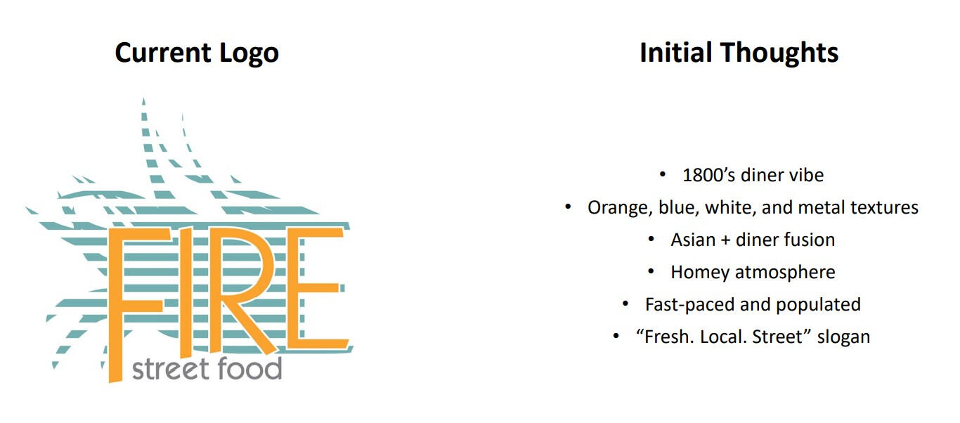 This project was about rebranding a local business' logo. I chose the sit-down restaurant, Fire Street Food, in Savannah, GA. It was one of the first Asian restaurants that I felt at home with, and fell in love with their South-East Asian American fusion dishes.Growing up in a restaurant myself, I was accustomed to observing my father toss woks while sautéing vegetables and eating his take on American Chinese food. I also grew up eating classic American breakfasts with my Godpapa at the local diner. When I moved to Georgia for college, I missed eating my father's food and the feeling of sitting down to eat, and started looking for a taste of home.With its Asian-meets-diner atmosphere, Fire Street Food has always had a warm place in my heart.I wanted to create a design that combined the feeling of Asian street food and carts with the casual vibe of diners, something sleek but also approachable, purposeful, and marketable.